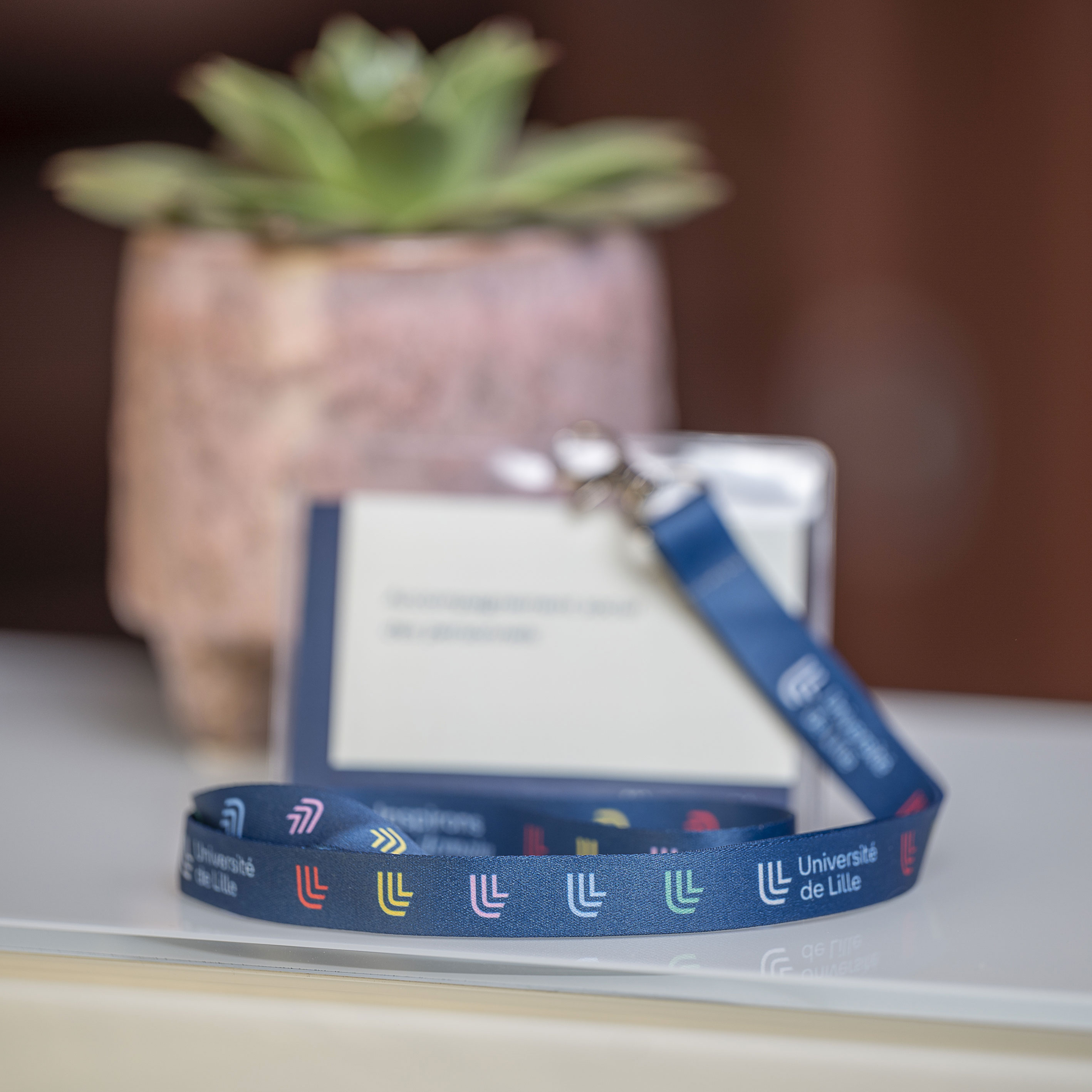Le tour de cou Université de Lille est un cordon satiné bleu marine, habillé de logos de l'Université. Vous le remarquerez décliné dans sa version classique en blanc, mais aussi les trois L en plusieurs couleurs. La baseline de l'Université, Inspirons demain, complète le graphisme.