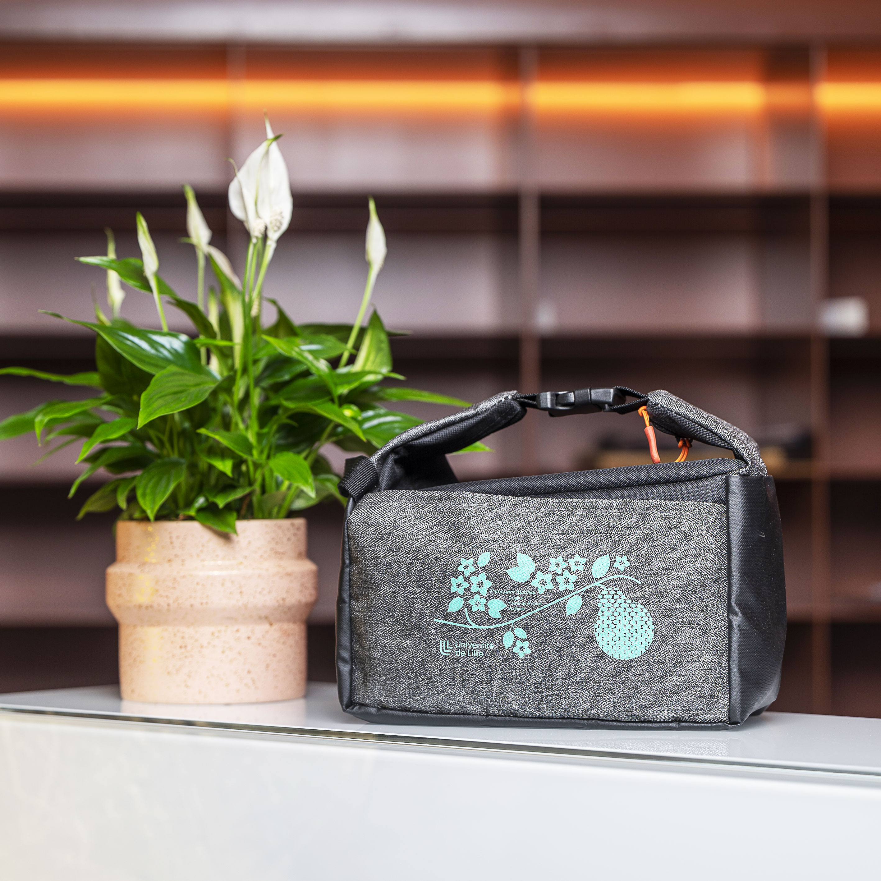 Equipé d'une poche à l'avant, le sac se ferme grâce à un zip. Il possède également une boucle de fermeture faisant office de poignée et pouvant être utilisée pour accrocher le sac à un crochet, un guidon de vélo ou à une bandoulière. Il peut facilement contenir une boîte repas d'1L ainsi qu'une gourde de 650ml.